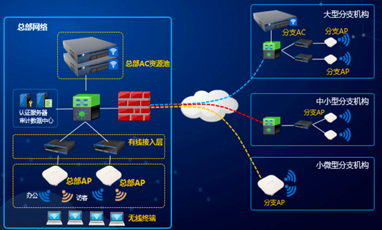 5、漫遊效果差:不能(néng)實現二三層漫遊,移動辦公時(shí),業務中斷。結合用戶無線網絡需求情況,結合華爲産品技術特點,爲了滿足用戶構建一個高速、穩定、安全、可靠、易于管理的無線接入網絡的需求,本設計方案按照AP+AC的結構化無線網絡解決方案進(jìn)行設計。具體設計爲在總部設置總部AC,在大型分支機構設置分支AC與分支AP,中型分支機構設計二級,三級交換機,分支AP。小微型分支機構直接設置分支AP。總部AC可以對(duì)大型分支機構的AC進(jìn)行管理,當網點控制器采用集中管理的模式進(jìn)入到中心端控制器時(shí),會(huì)自動下載中心端的公共配置,比如IP組、MAC地址庫、時(shí)間計劃、角色授權、認證頁面(miàn)等 。總部AC也可以直接管理中小型分支機構的分支AP,實現統一管理。方案設計: